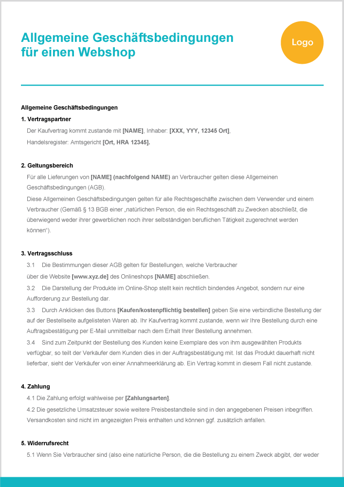 Die Allgemeinen Geschäftsbedingungen schaffen somit für Massenverträge eine einheitliche Regelung der Rechtsbeziehungen und vereinfachen somit den Geschäftsverkehrt deiner Unternehmung.