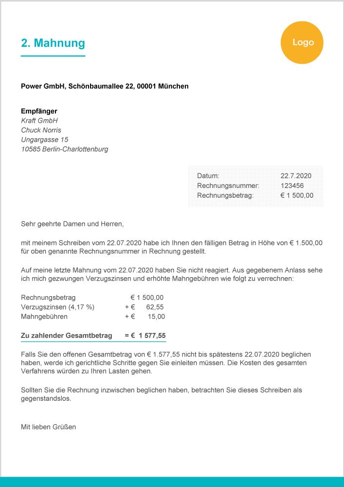 In der 2. Mahnung erwähnst du, dass du gerichtliche Schritte, sei es durch einen Rechtsanwalt oder ein Inkassounternehmen einleiten wirst, wenn dein Kunde nicht in der angegebenen Zahlungsfrist zahlt.