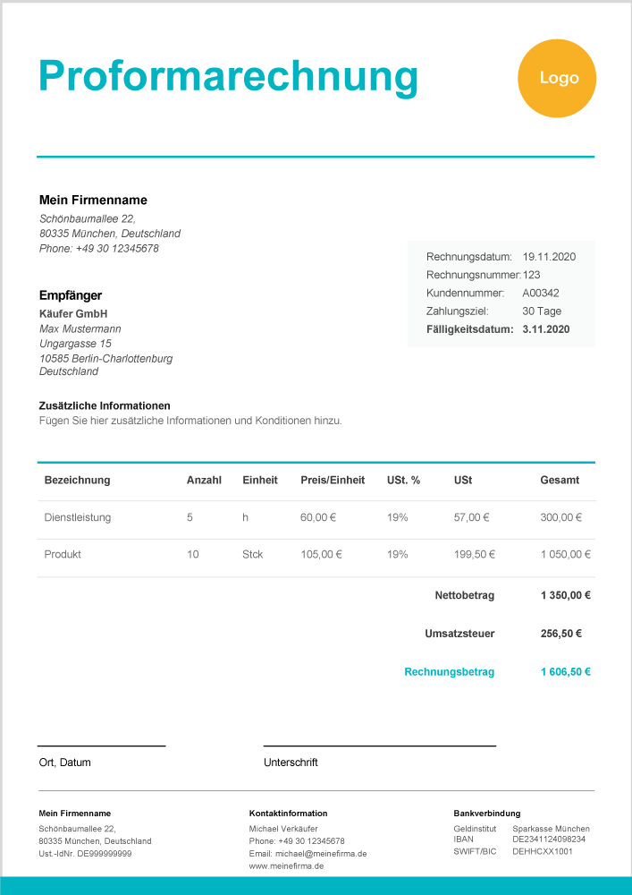 Damit du Zeit und Aufwand sparen kannst, haben wir dir hier eine Vorlage für eine Proformarechnung erstellt. Darin enthalten sind: