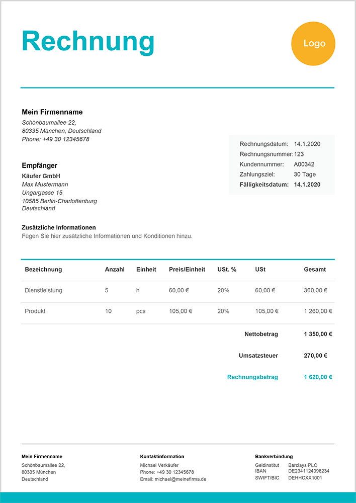 - Zusätzliche Informationen: Beschreibe hier vereinbarte Konditionen und in Rechnung gestellte Leistungen und Produkte.