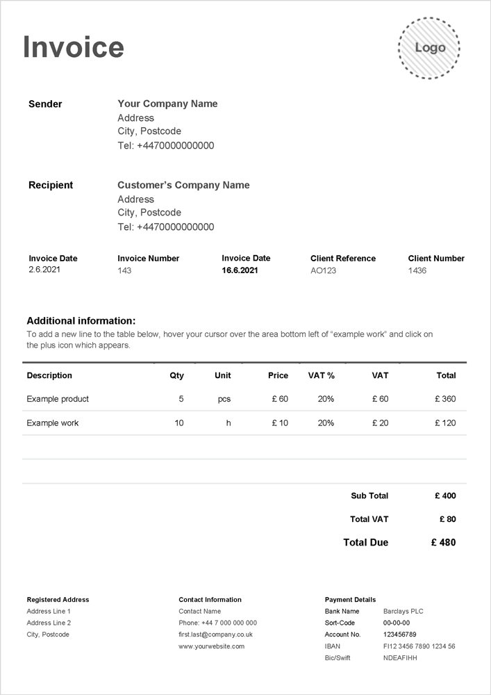 These invoice templates are suitable for freelance work, for sole traders and for larger, VAT registered companies – just check whether you’re downloading a VAT invoice or a non-VAT invoice.