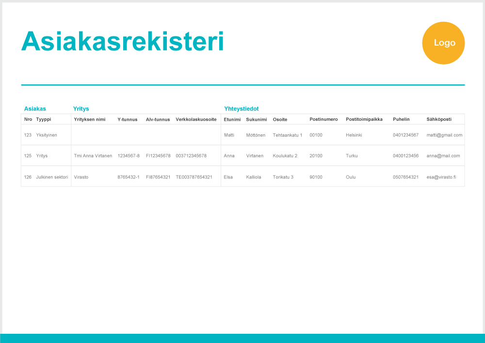Tarjoamassamme Excel-pohjassa on valmiina kohdat asiakkaiden tärkeimmille yhteystiedoille, kuten:
