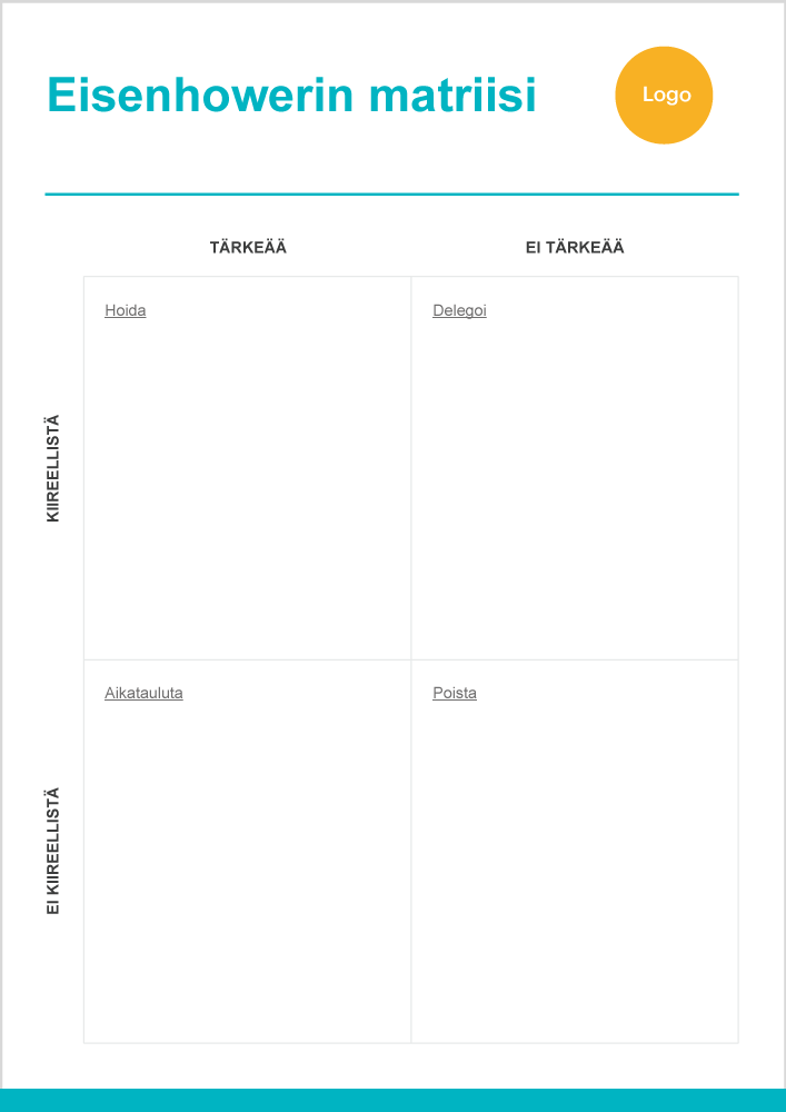 Lataa ilmainen pohjamme Eisenhowerin matriisin tekemiseen. Voit muokata pohjaa Microsoft Excelissä tai tulostaa sen paperilla täytettäväksi. Eisenhowerin matriisia voi käyttää to do -listan järjestelemiseen säännöllisesti tai aina silloin, kun työkuorma uhkaa kasvaa liian suureksi.