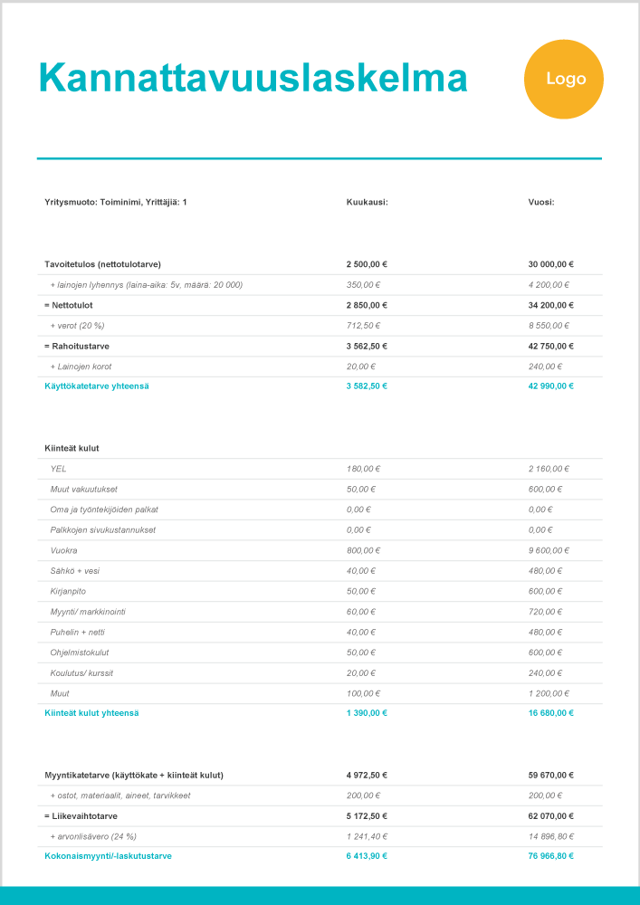 Ole realistinen tavoitetuloksen kanssa, mitä suuremman palkan haluat/ tarvitset, sitä suurempi tulee myös olla tavoitetulos, joka puolestaan vaikuttaa erityisesti rahoitustarpeeseen ja laskelman lopussa selviävään laskutustarpeeseen eli myyntiin.