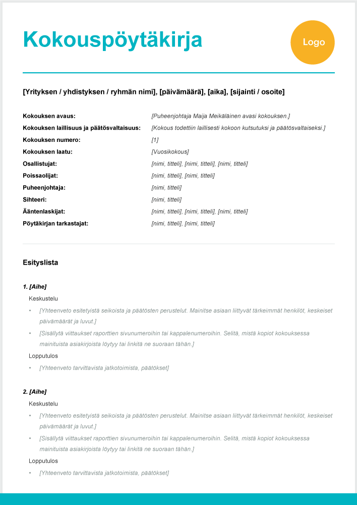 Lataa tästä ilmainen Word-pohja kokouspöytäkirjalle ja kokousmuistiolle. Voit täyttää pohjan tekstinkäsittelyohjelmalla kokouksen aikana tai käyttää sitä pöytäkirjan laatimiseen kokouksen jälkeen.