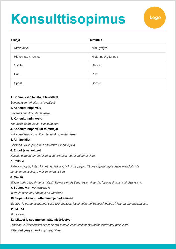 Konsulttisopimuspohjamme sisältää valmiiksi kohdat sopimuksen taustalle ja tavoitteille, sopimuksen tarkoitukselle, konsultointitehtävien kuvaukselle, aikataululle, osallistuville henkilöille, mahdollisille alihankkijoille, vakuutuksille, osapuolten ehdoille ja velvoitteille, palkkiolle sekä maksulle. Sopimuksen loppuun merkitään sopimuksen voimassaoloaika, liitteet sekä sopimuksen muutoksen ja purkamisen ehdot.