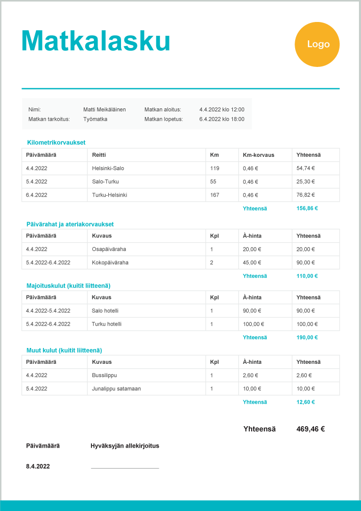Valmis pohjamme tarjoaa matkalasku esimerkin. Sille voi laittaa seuraavat tiedot: