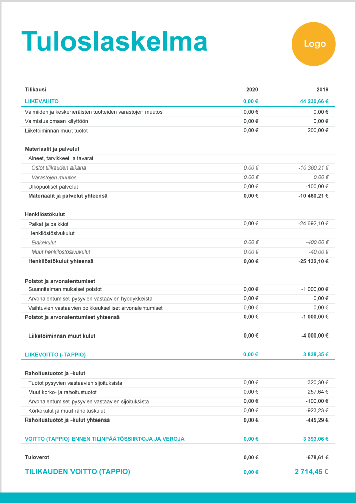 Nyt tuloslaskelma näyttää liikevaihdostasi jääneen liikevoiton tai tappion. Tämän jälkeen käsittelyyn otetaan vielä erilaiset yrityksen rahoitukseen liittyvät seikat.