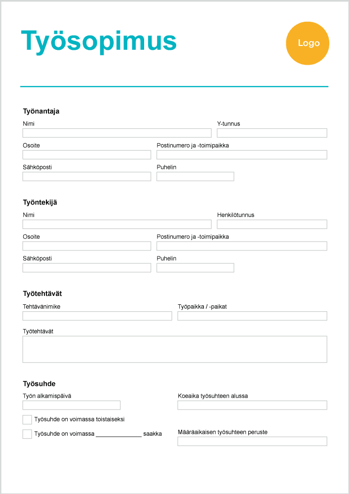 - Työsuhteen alkamis- ja päättymisaika: Tähän kohtaan kirjataan työsuhteen alkamisaika sekä määräaikaisen työsopimuksen kesto sekä mahdollisen koeajan kesto. Työsopimuslain mukaan koeaika saa olla maksimissaan kuusi kuukautta.