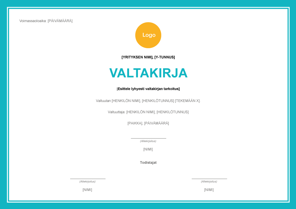 Teimme valmiin vapaamuotoisen valtakirjan. Muista, että voit lisätä/poistaa kenttiä, vaihtaa värejä ja muuttaa sitä tarpeesi mukaan.