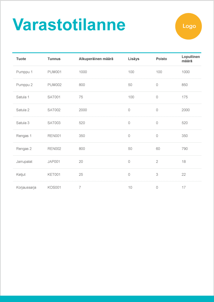 - Varastotilanne – Kun olet listannut tuotteesi, avaa tämä välilehti ja lisää tuotteiden alkuperäinen määrä. Kaikkien kolmannelle välilehdelle lisäämiesi tuotteiden pitäisi jo näkyä valmiina.