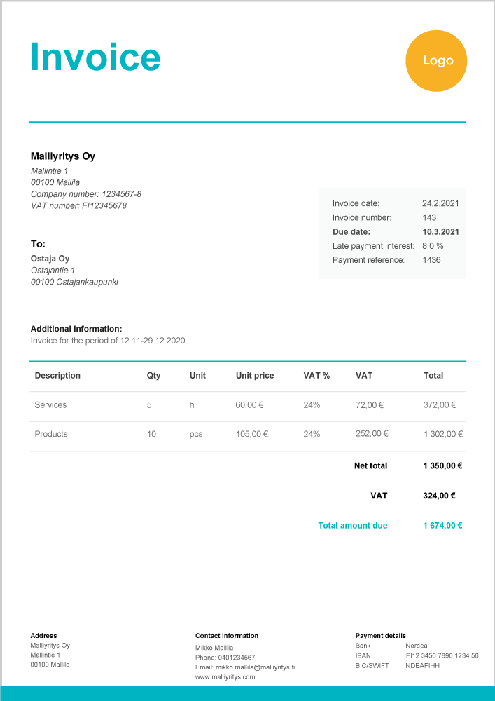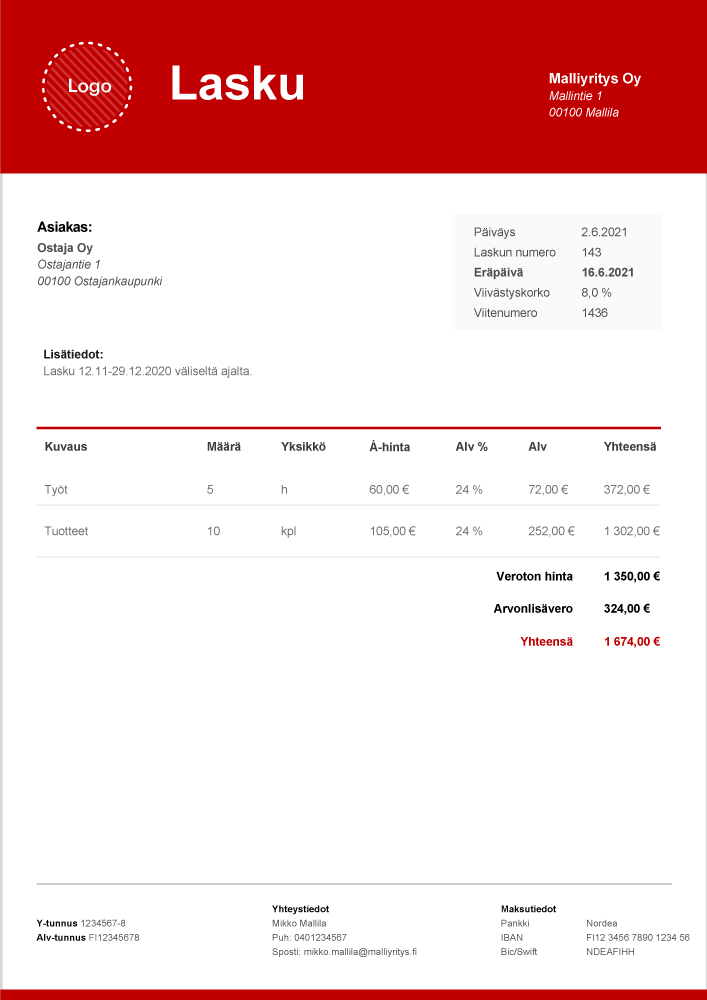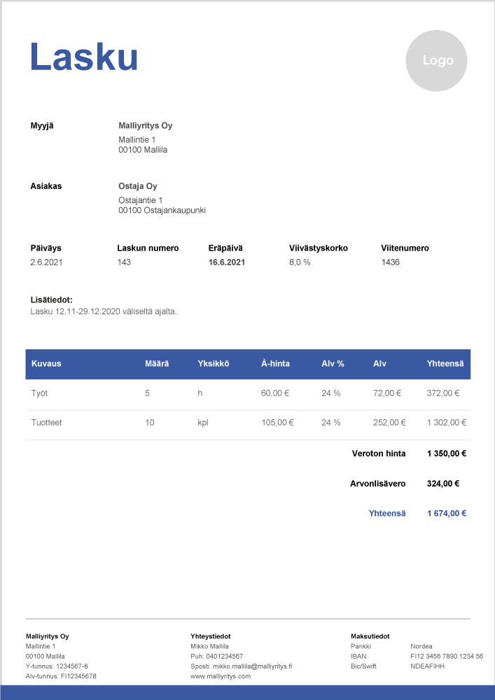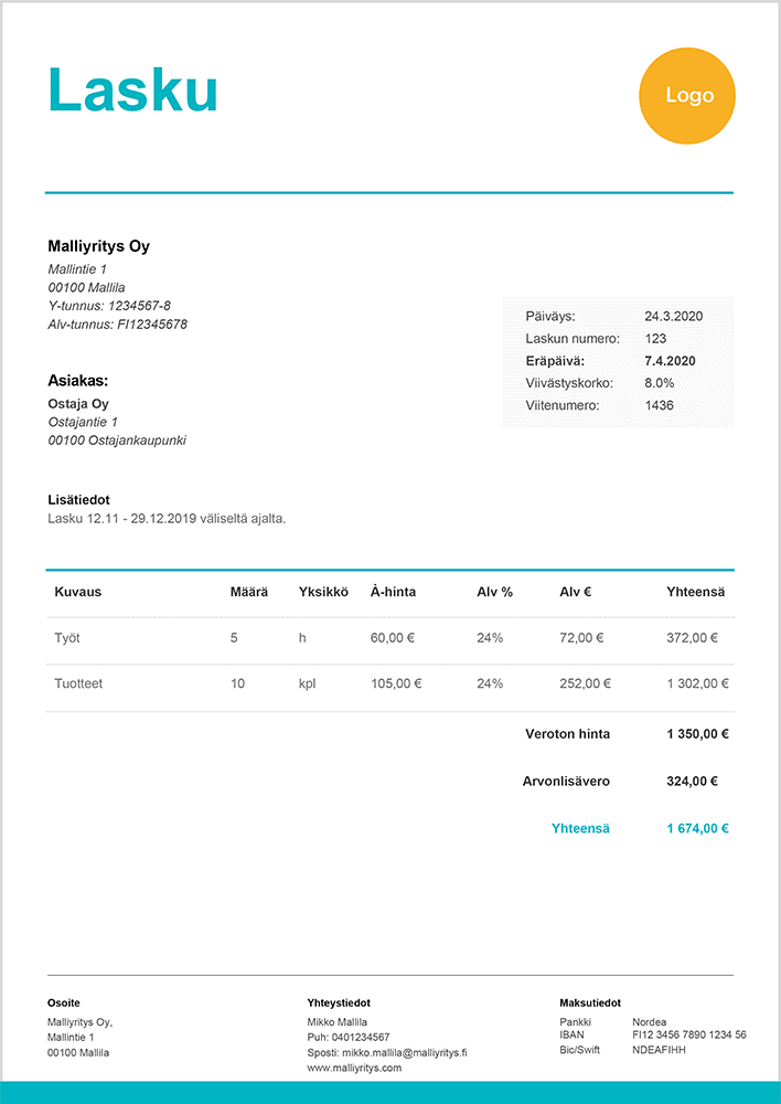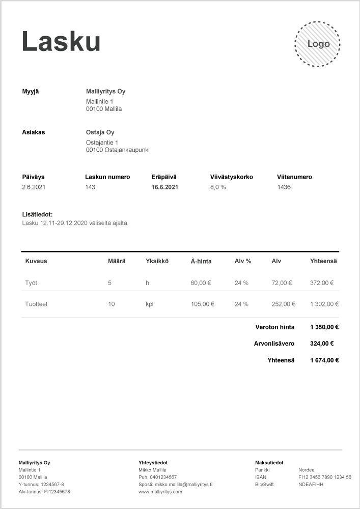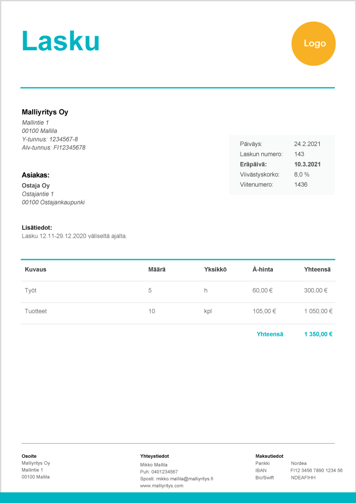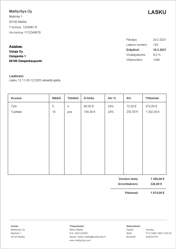 - Maksuaika – tyypillisiä maksuaikoja ovat esimerkiksi 7 päivää, 14 päivää ja 30 päivää.