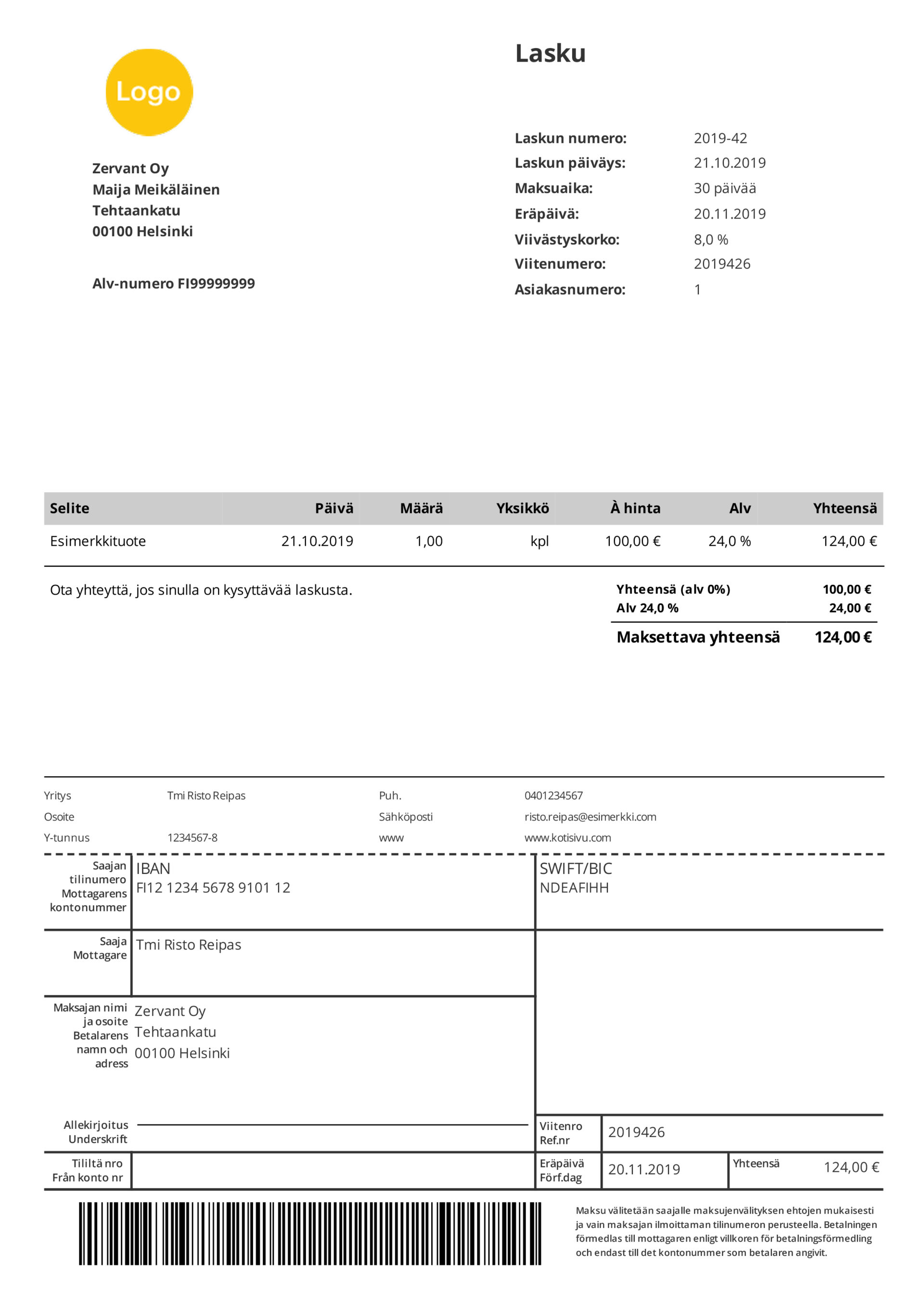 - Viitenumero – viitenumero ei ole pakollinen, mutta helpotat sillä laskun maksamista. Viitenumerolaskuri auttaa luomaan oikeanlaisen viitenumeron.