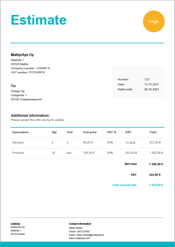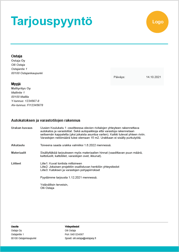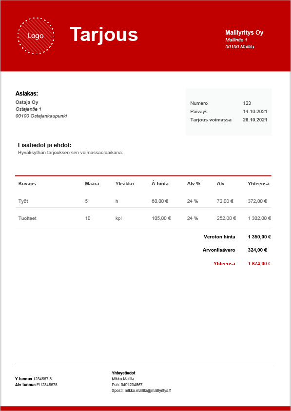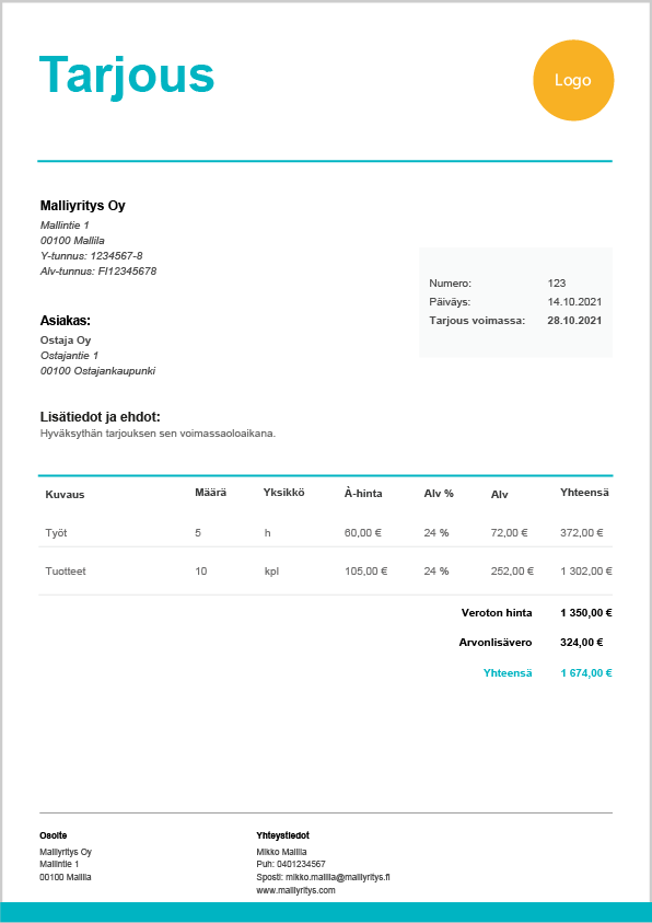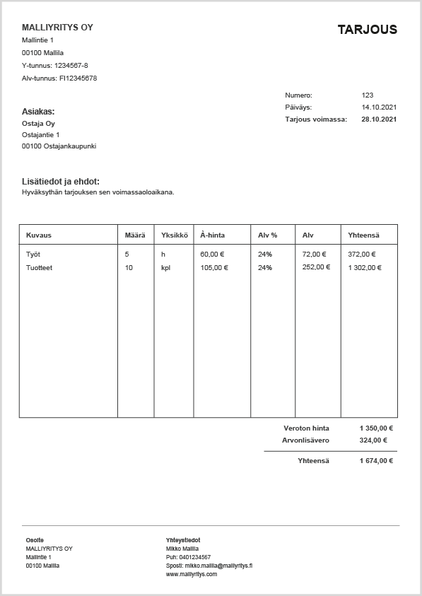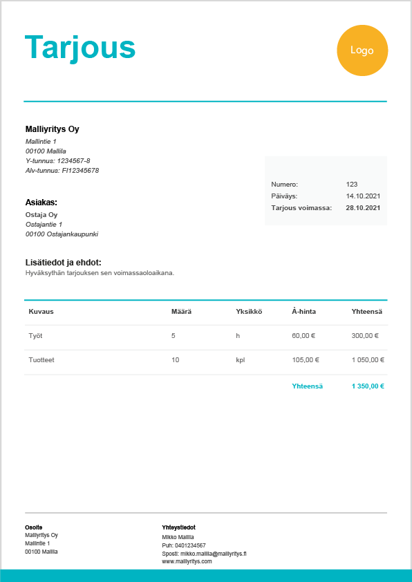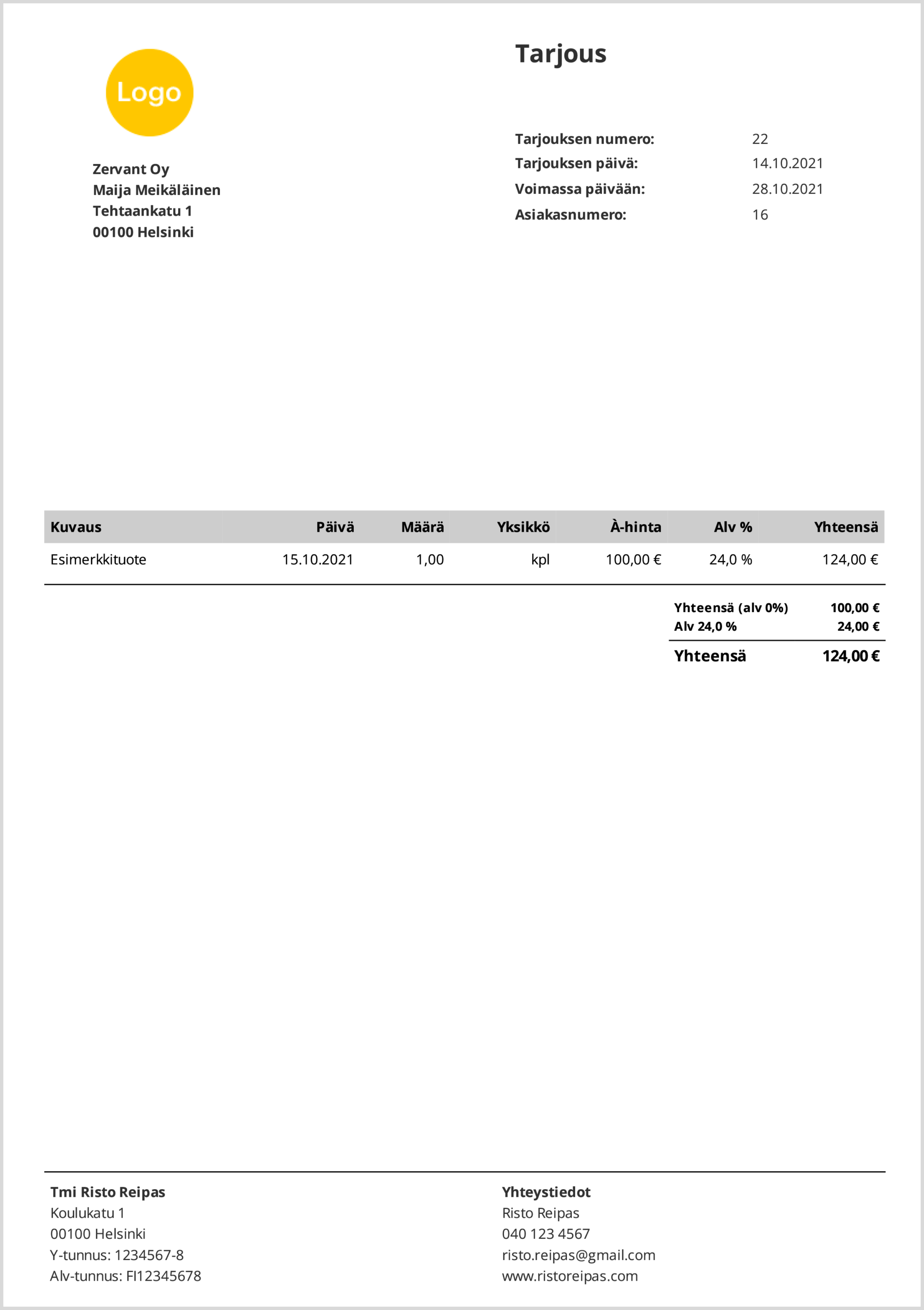 Tarjouksilla ei ole niin paljon vaatimuksia kuin laskuilla. On kuitenkin hyvä sisällyttää seuraavat perustiedot: