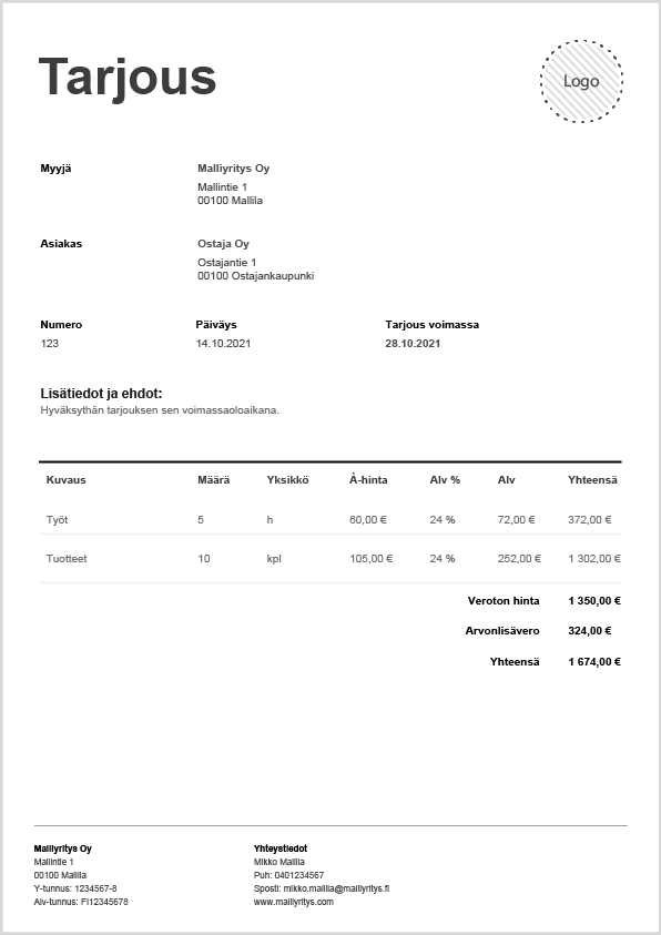 Voit myös antaa lisätietoja, ohjeita tai muita ehtoja. Pohjissamme on annettu tarjoukselle numero: numerointi auttaa sinua pitäämään kirjaa tarjouksistasi, löytämään tietyn tarjouksen helpommin ja arkistoimaan ne. Numero ei kuitenkaan tarjouksissa (toisin kuin laskuissa) ole pakollinen.