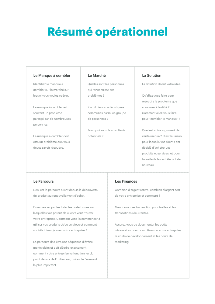 Les rubriques, que l’on retrouve à l’intérieur de ces trois sections, varient assez peu. Gardez toujours à l’esprit, lorsque vous choisissez un exemple de business plan, qu’il doit être clair, précis et logique, et doit pouvoir être adapté selon vos interlocuteurs.
