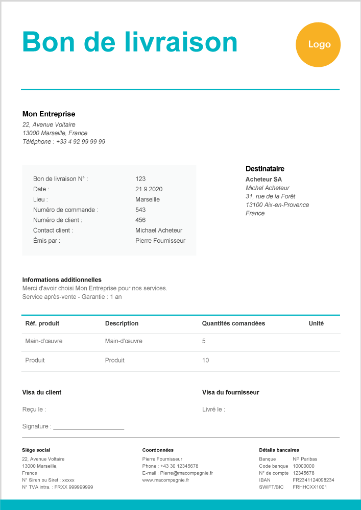 Nous vous proposons un modèle de bon de livraison sous Word et Excel que vous pouvez adapter selon votre entreprise, produits et services. Le bon de livraison est vierge et vous pouvez le personnaliser aux couleurs de votre entreprise. Le modèle que nous vous fournissons peut également vous servir d’exemple de bon de livraison car il est déjà rempli avec les données d’une entreprise témoin.