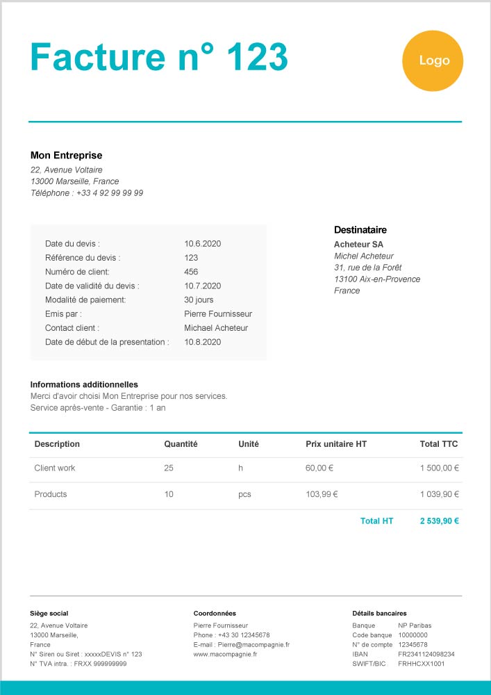 - Infos entreprise : Faites figurer les coordonnées de votre entreprise. Le numéro de SIRET est notamment obligatoire.