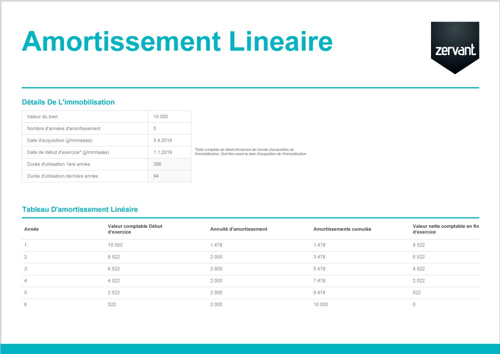 Exemple : Un bien d’une valeur de 1000€ amortissable sur 5 ans sera déprécié de 200€ tous les ans (1000€ / 5 = 200€ ou 1000€ x 20%).