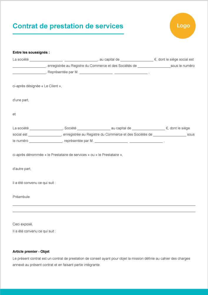 Notre exemple de contrat de prestation de services, exemple gratuit au format pdf ou au format word, vous permettra de créer rapidement votre modèle que vous pourrez ensuite décliner selon vos besoins et vos clients. Vous pouvez même vous servir de notre modèle de contrat de prestation de service word gratuit comme modèle de contrat de partenariat.