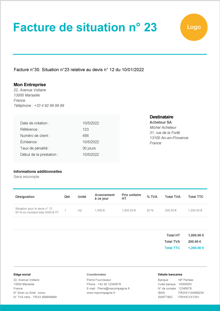 - L’en-tête de votre facture de situation. Celle-ci doit contenir les informations quant à votre entreprise et à celle de votre client, que ce soit un professionnel ou un particulier. Nom, raison sociale, numéro de SIRET, numéro d’identification à la TVA, adresse… Toutefois, si votre client est une personne physique, il peut refuser que l’adresse de son domicile apparaisse ;