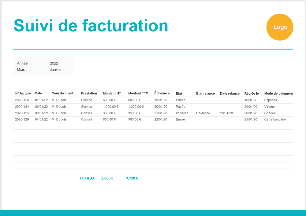 Le suivi de facturation existe pour réunir ces statuts, assurer l’équilibre financier de l’entreprise et lui permettre de se projeter à court, moyen et long termes quant à ses ressources. Aussi, c’est le tableau de bord indispensable à tout chef d’entreprise pour superviser la gestion de son activité.