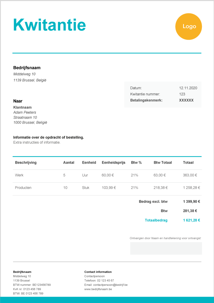 Net al bij een factuur of offerte moet een kwitantie aan een aantal eisen voldoen. Het is dan een geldig document voor de administratie. We raden aan om er de volgende gegevens op te zetten: