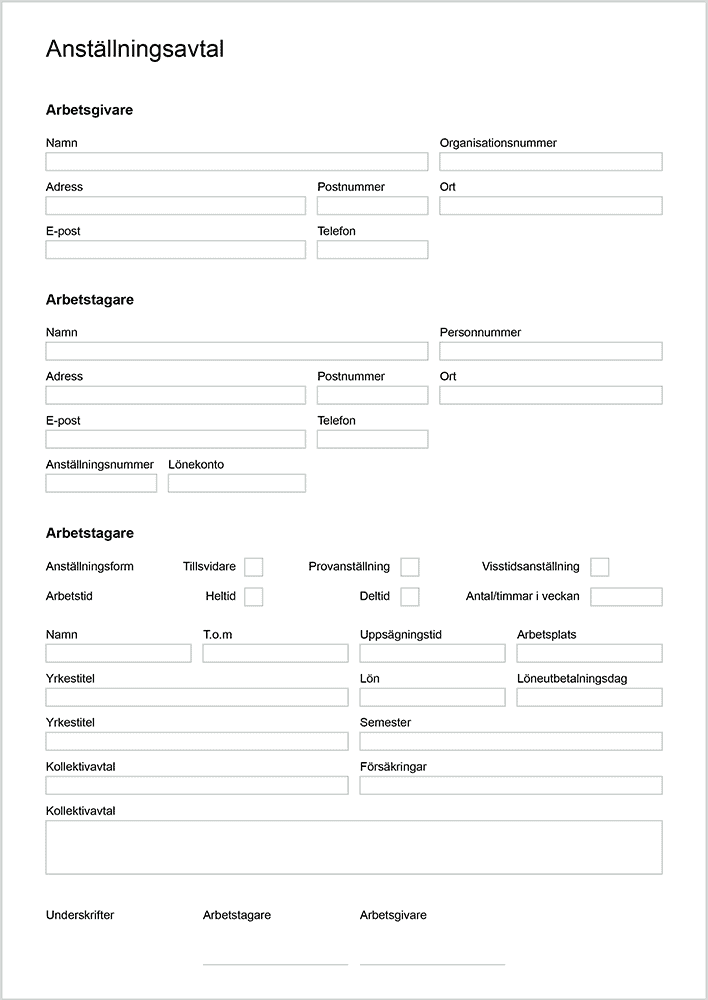 - Arbetsgivarens och arbetstagarens namn och adress.