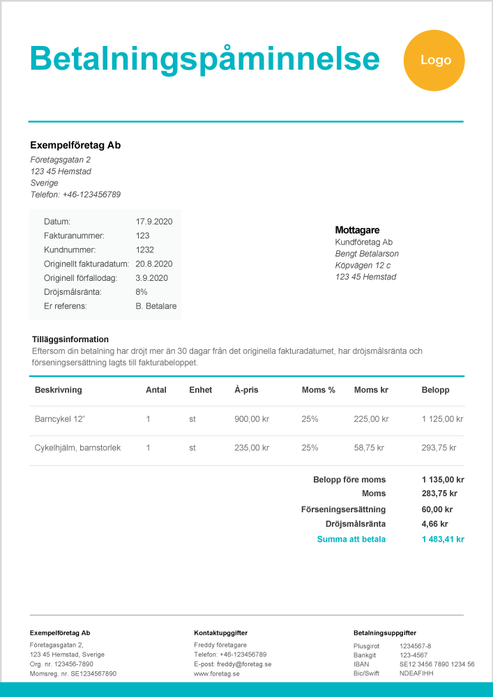 Om din kund är försenad med en betalning kan du skicka en betalningspåminnelse. Det finns inget krav på att du måste skicka en betalningspåminnelse och heller inget krav på hur den i så fall ska se ut. Men det är bra för både ditt företag och din kundrelation att du skickar en. Men innan du skickar är det viktigt att du har koll på vilka regler som gäller för till exempel förfallodag, dröjsmålsränta och förseningsersättning.