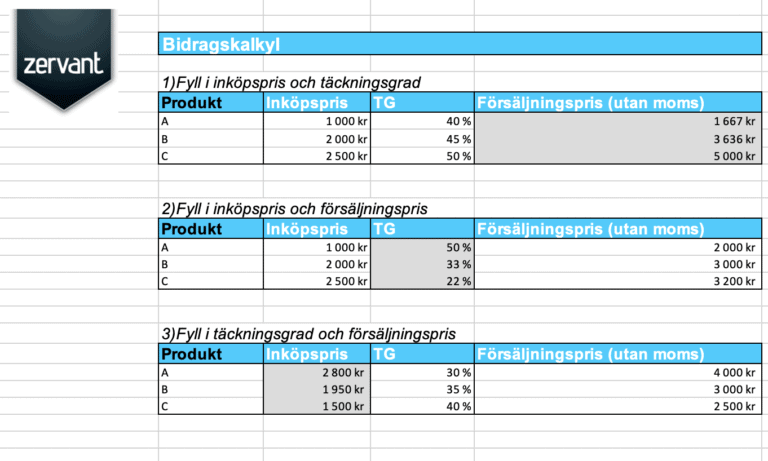 Med Zervants bidragskalkyl kan du räkna ut täckningsgraden och täckningsbidraget med hjälp av inköps- och försäljningspriset. Du kan också räkna ut inköps- eller försäljningspriset istället ifall du har en viss täckningsgrad du vill uppnå. Kalkylen fungerar som ett bra stöd och ett behändigt verktyg för att planera priser.