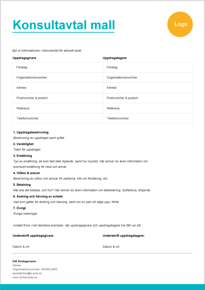 När du förbereder ditt avtal ska du tänka på att vara så tydlig som möjligt. Vad avtalet ska innehålla beror mycket på uppdraget som du ska utföra. Här följer några viktiga delar av ett typiskt konsultavtal, som också finns med i vår mall som du kan ladda ned: