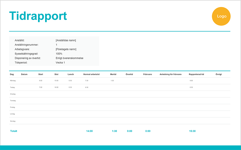 Mallen för anställda är byggd så att den anställda lägger in start tiden, slut tiden och lunchpausen, varefter mallen automatiskt räknar ihop den totala arbetstiden för dagen i fråga. Mallen fungerar såväl för delanställda som fulltidsanställda.